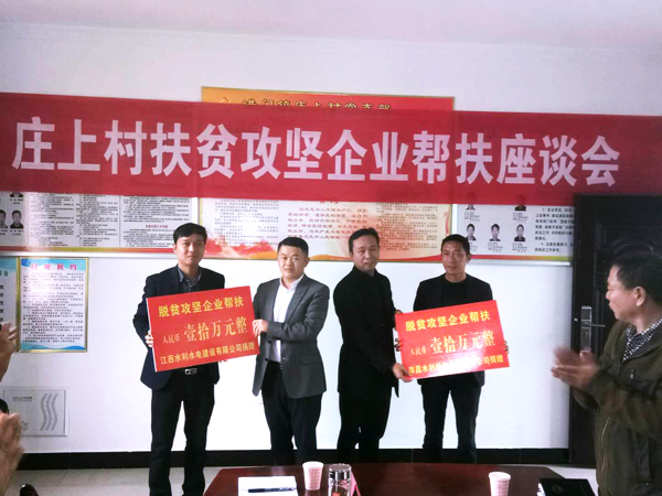 为认真贯彻落实党的十九大关于坚决打赢脱贫攻坚战的新安排新要求,践行企业的社会责任。11月17日,公司副总司理王俊华同志率抚州廖坊灌区二期工程施工总部认真人胡福民、项目财务部认真人肖志兵代表江西省水利水电建设有限公司前往南城县洪门镇加入庄上村扶贫攻坚企业帮扶座谈会,并将公司捐助的10万元扶贫资金送至庄上村村委会。